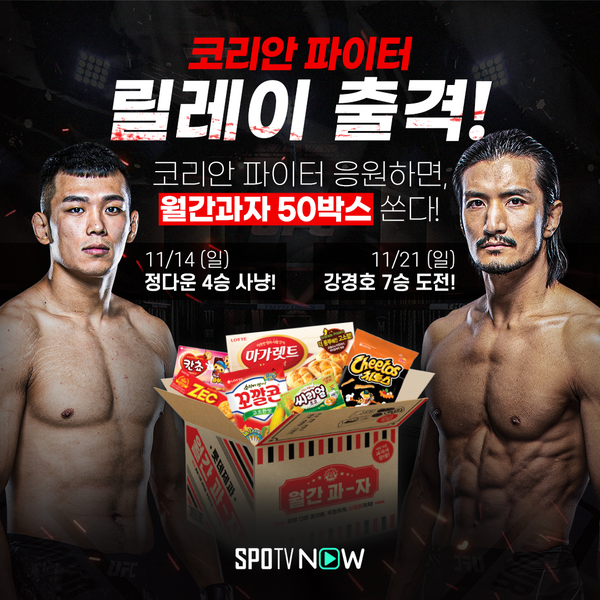 SPOTV NOW에서 준비한 이벤트, 내일(14일, 일)과 오는 21일(일) 진행되는 UFC 코리안 파이터, 정다운 선수와 강경호 선수를 응원하고 롯데제과 월간과자 받아가세요!